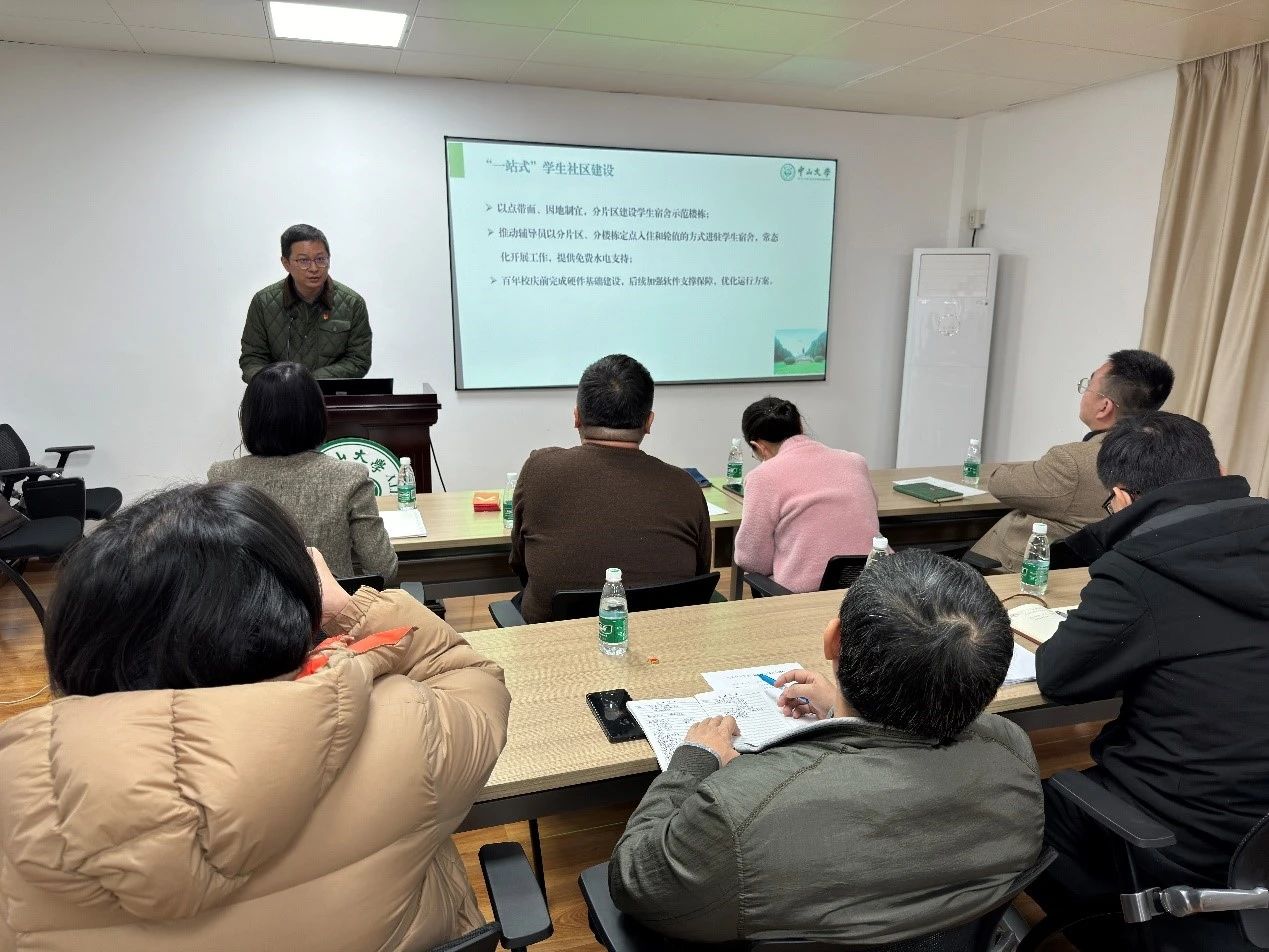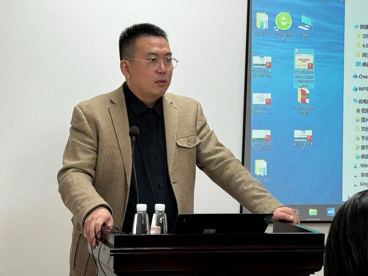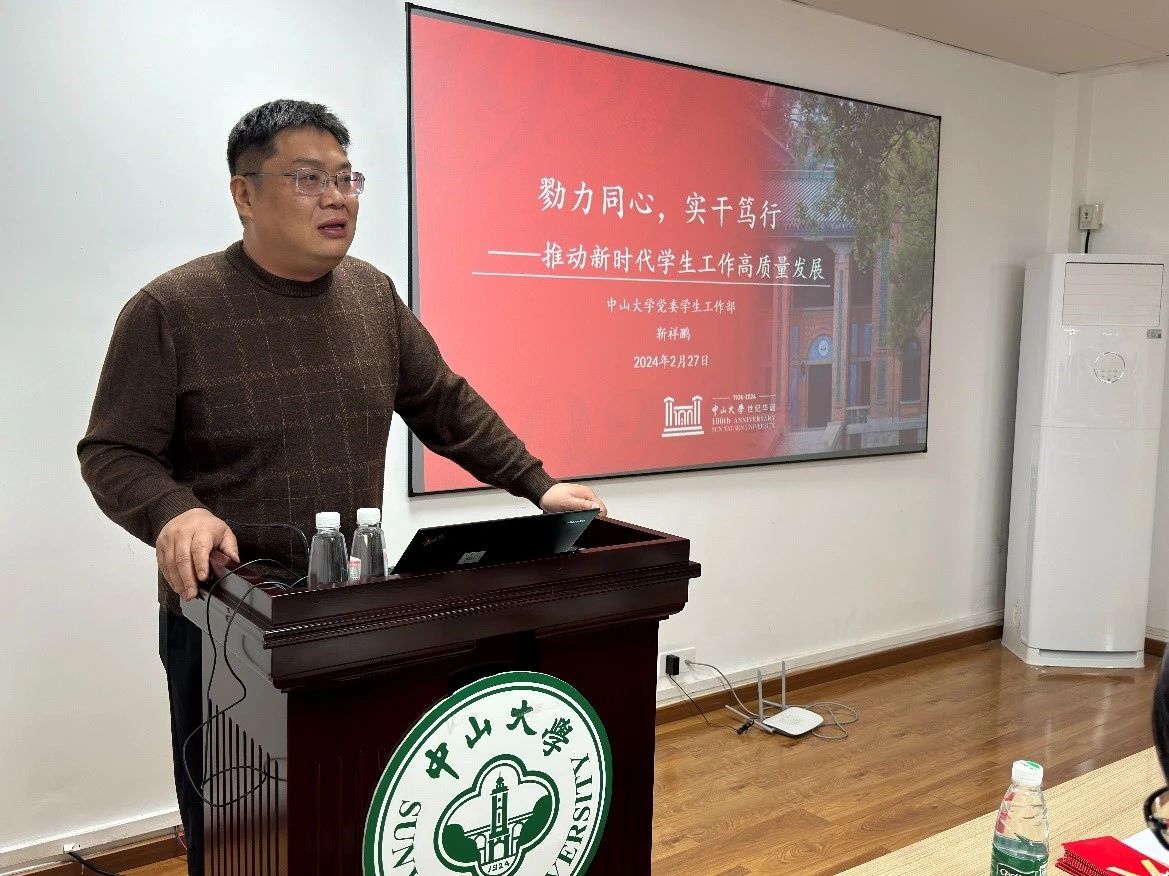 党总支书记靳祥鹏同志讲授以《勠力同心,实干笃行——推动新时代学生工作高质量发展》为主题的专题党课,从“学理论、悟精神、明内涵、强行动”四个方面展开讲解。首先导学习近平总书记关于“高质量发展”的论述,带领与会人员深入学习高质量发展的历史规律、我国高质量发展的历史方位以及“新质生产力”的内涵。接着传达2024广东高质量发展大会的重要会议精神,带领与会人员认真学习黄坤明书记在大会上的讲话要点,感悟广东高质量发展的步伐与信心。之后学习朱孔军厅长在会上的表态发言,深入思考“高质量发展,教育何为?”这一深刻命题。结合高松校长采访发言,他提出在百年校庆新征程上实现高质量发展的特色学工路径。他将新时代学生工作归纳为“六个新”,即“新形势、新特点、新展现、新要求、新需求、新标准”,指出新时代学生工作应着眼于新时代党和国家的发展战略,以深化学生工作供给侧结构性改革为主线,推动学生工作高质量发展。最后布置了新学期工作要点,勉励与会人员持续提升自我,激发工作动力,以优异成绩献礼百年校庆。