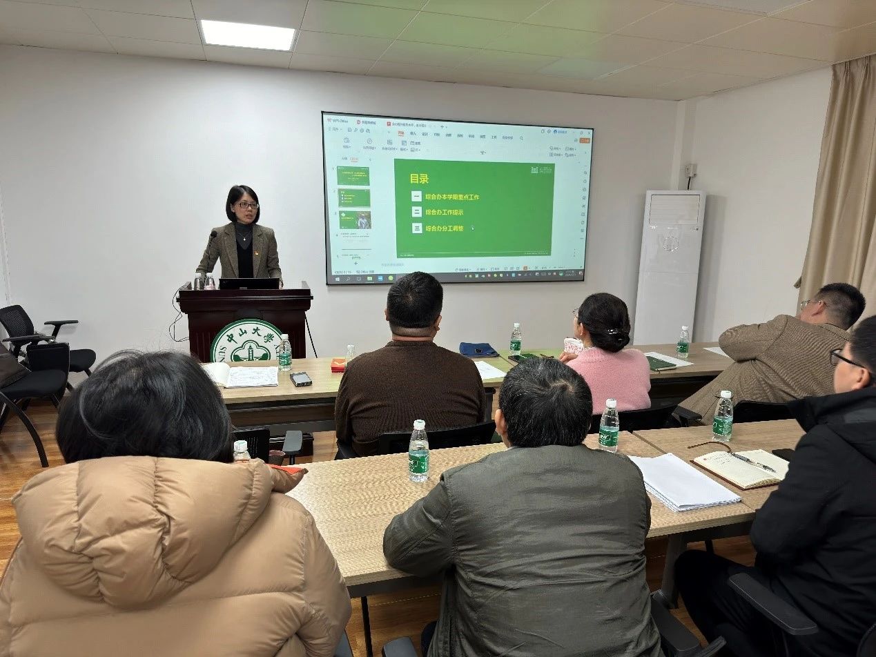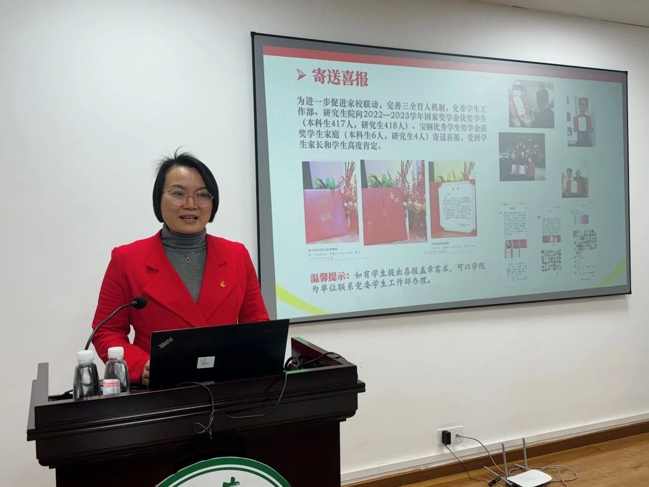 校党委张琪副书记作总结讲话,她强调在学生工作中应相信“三个力量”,即相信“看见”的力量、相信“相信”的力量和相信“改变”的力量,给学生成长空间和时间,相信一代更比一代强。接下来应全力打造高素质、服务型、创新型的学工队伍,坚持以学生成长为中心,坚信“成长”比“成功”更重要。面对新形势新变化,她指出“不确定性是最大的确定性”,要保持政治定力,坚持纯正底色,满怀信心,攻坚克难。最后她向与会人员致以新年祝福,希望在新的一年与各位学工队伍的同仁继续共同奋斗,走好新时代学生工作长征路。