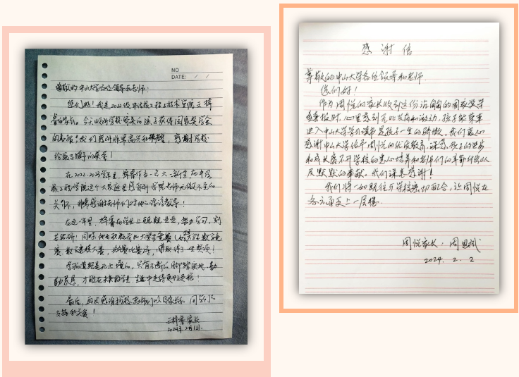 世纪中大,山高水长。优秀学生的成长,更加离不开家人的支持和陪伴。为获奖学生家庭寄送喜报是家校联动的实践,更是家校协同育人的桥梁。今后,3044永利将继续落实立德树人根本任务,以学生成长为中心,采用助学-促学-奖学-优学“四学一体”内涵式助学育人模式,支持培养学生“学习力、思想力、行动力”,涵养学生创造力,促进学生德智体美劳全面发展。让学校与家庭携手前行,为党和国家培养出更多堪当重任的社会主义建设者和接班人!