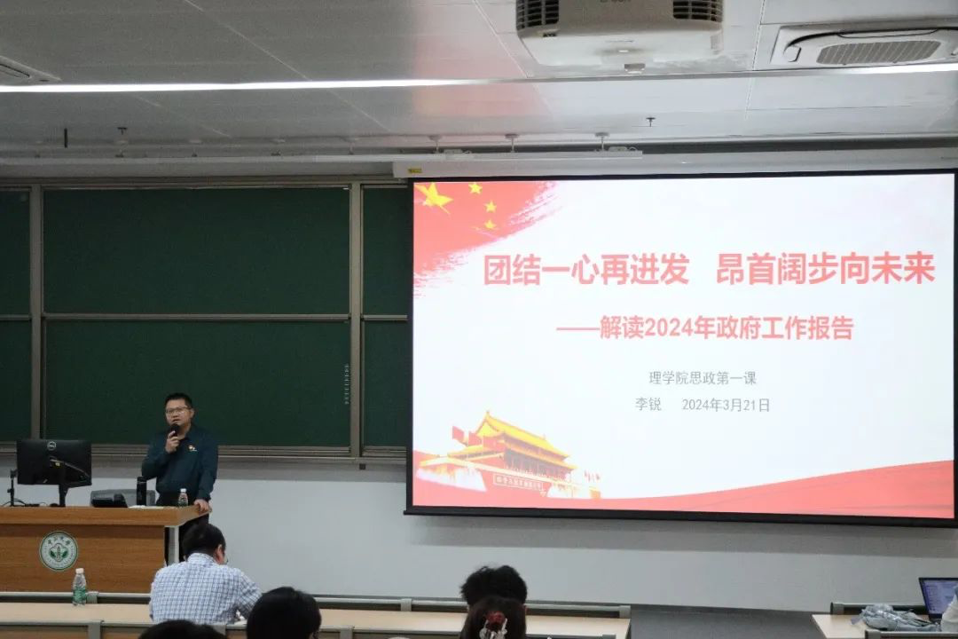 近日,理学院直属党支部书记李锐、副院长(主持工作)殷朝阳教授分别为2021级本科生、2022级本科生、2023级本科生讲授春季学期思政第一课。直属党支部华毅副书记作课堂总结。他表示学院将坚定牢记为党育人、为国育才使命,高度重视学科建设和人才培养,希望同学们坚定理想信念,厚植家国情怀,注重培养跨学科学习和研究的能力,做好学业发展规划,提高自身综合素质,成为能担当民族复兴大任的时代新人。