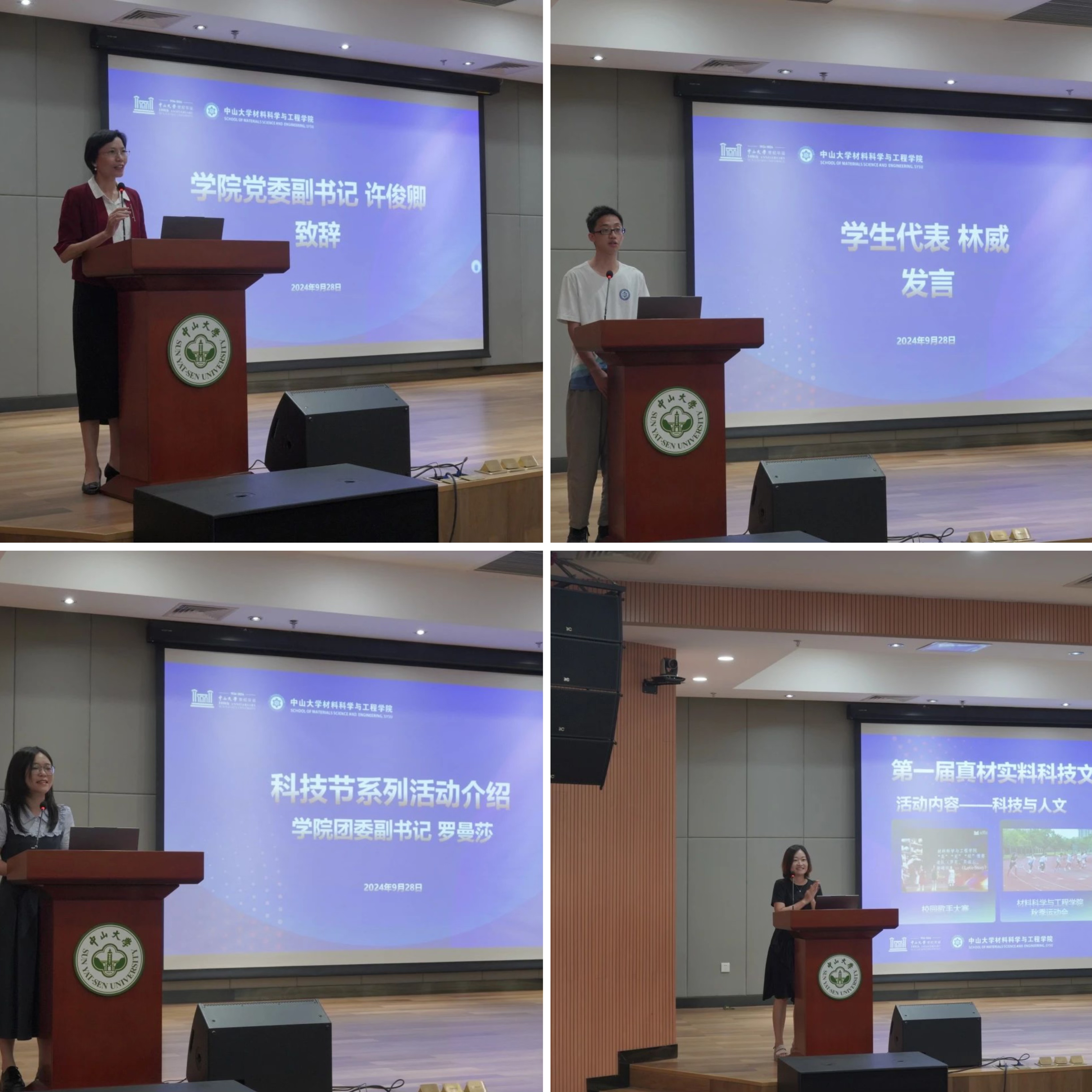 上午9:30,第一届“真材实料”科技文化节的启动仪式在化学材料综合楼B303报告厅举行,学院党委副书记许俊卿、团委书记董秋娉、实验教学中心欧阳红群老师、团委副书记罗曼莎、实验教学中心张欣怡老师出席启动仪式现场,2024级本科新生及各年级学生代表现场参与。启动仪式由学生会成员刘佳慧主持。