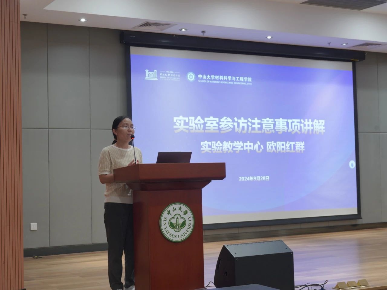 为了保证本次参访活动安全、有序进行,参访开始前,来自实验教学中心的欧阳红群老师为2024级本科新生做实验室安全教育。